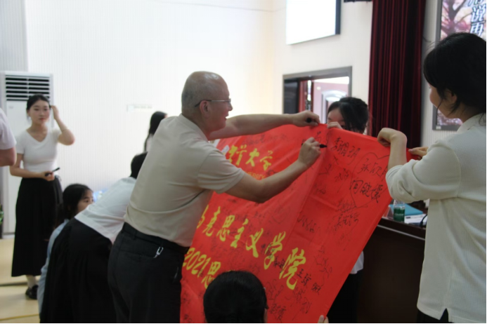 活动现场,肄业生首先向毕业生赠送手写祝福明信片。接着,班旗回收环节中,全体师生在旗帜上郑重签名,这面承载集体记忆的班旗,成为马院学子传承使命的庄严象征。最后,毕业欢送会在全体师生齐唱校歌的激昂旋律中圆满落幕。